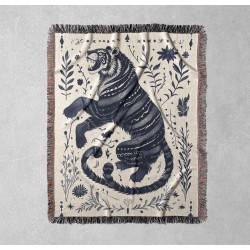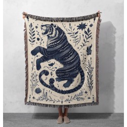 Majestic Tiger Motif: A bold indigo tiger in a dynamic pose, surrounded by botanical details, symbolizing strength, courage, and vitality.