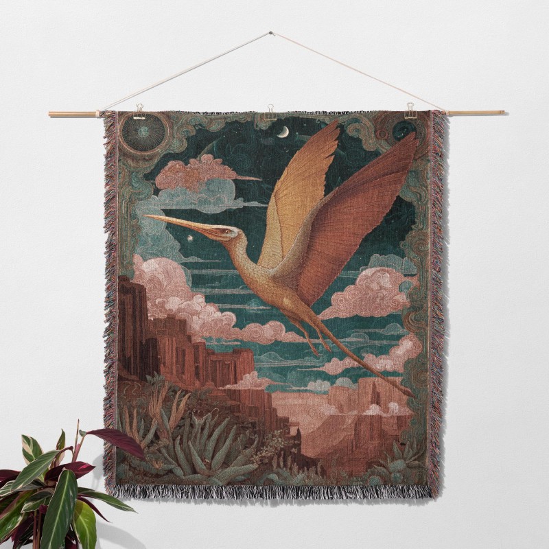 Wall Art: Functions as a tapestry, transforming the prehistoric flight scene into dramatic décor.
