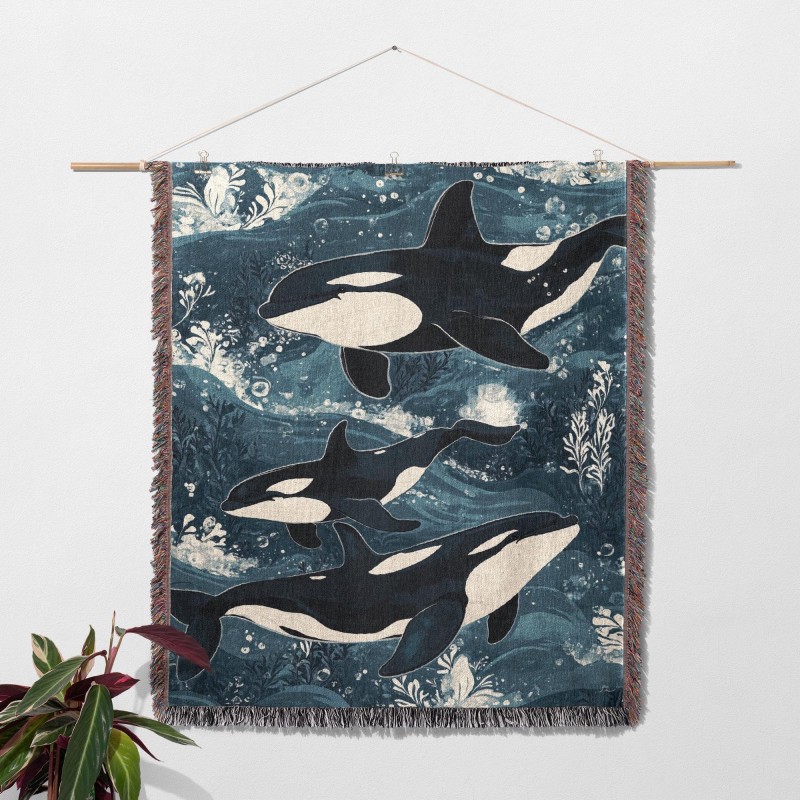 Majestic Orca Motif: Features a family of orcas swimming gracefully through a deep-sea setting, symbolizing unity and strength.