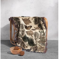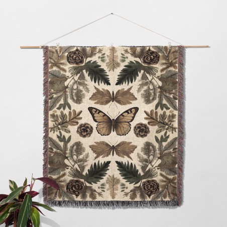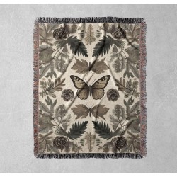 Measuring 60 × 50 inches (152 × 127 cm), this woven blanket captures the delicate harmony of nature with its vintage-inspired botanical and butterfly motif. A central butterfly is framed by mirrored arrangements of ferns, pinecones, and leaves, creating a balanced design that feels both organic and timeless.